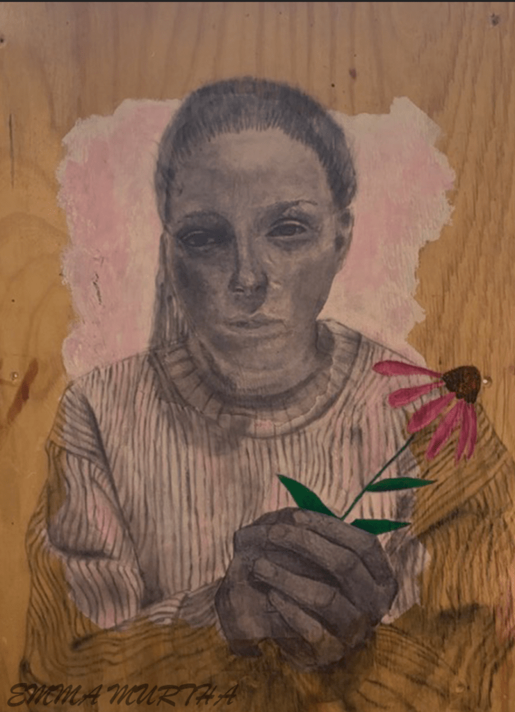 Mixed Media: Mod-Podge photo transfer, acrylic, powdered graphite 18×24.